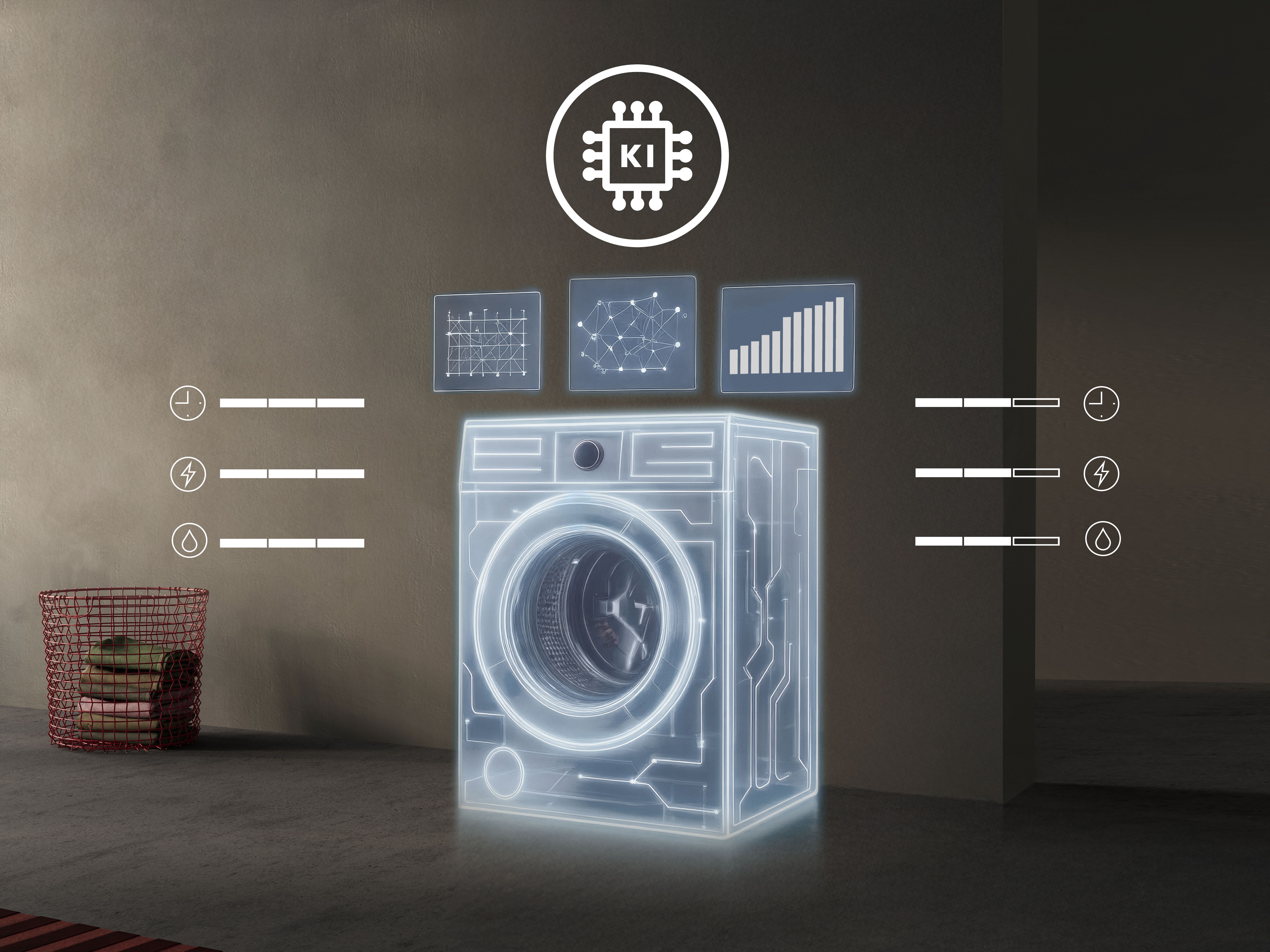 3 Interner Test für Zeit-, Wasser- und Energieverbrauch eines mit AI WashAssist optimierten 30 °C-Baumwollprogramms für 1 kg im Vergleich zur max.