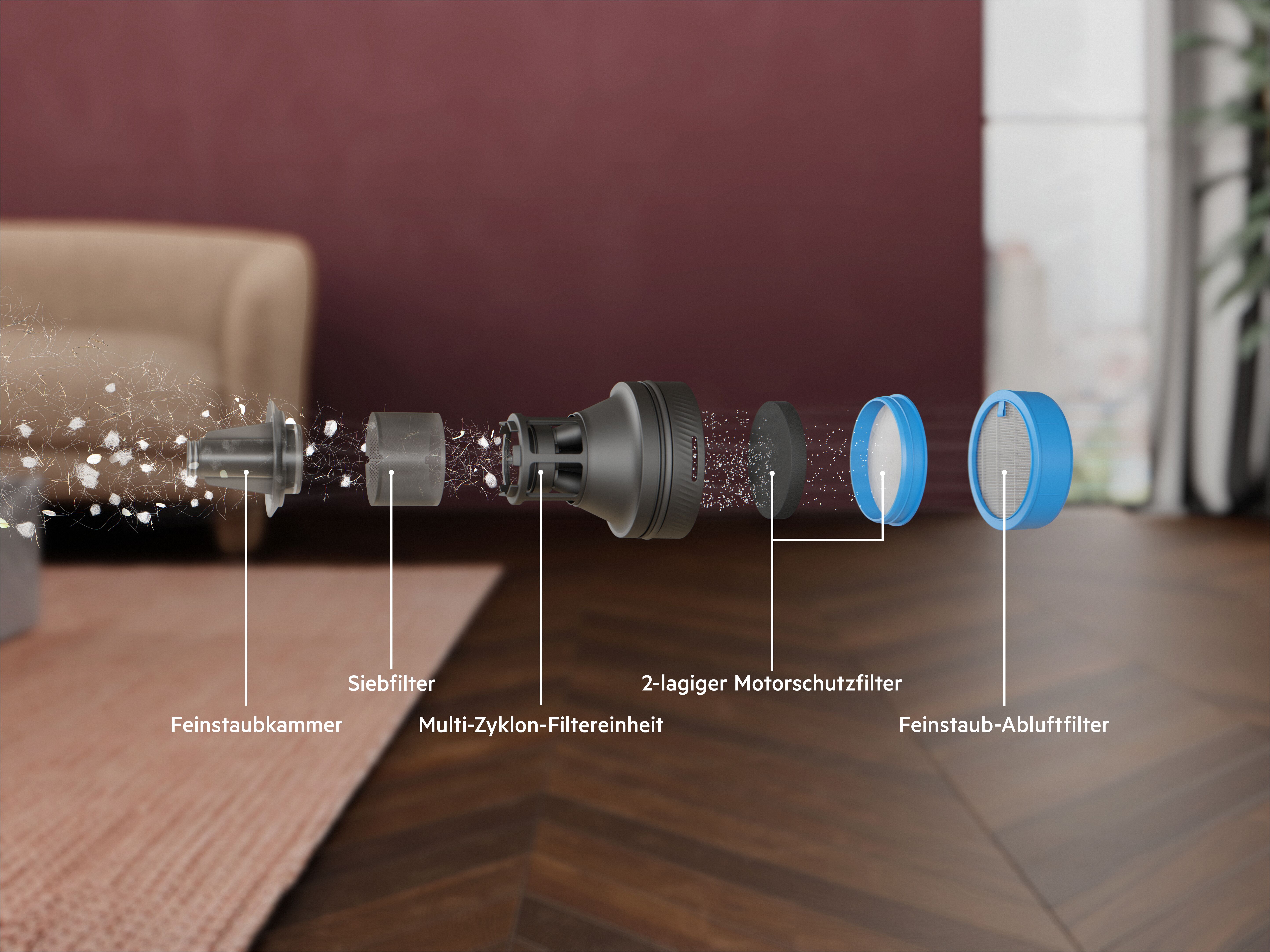 - sehr gute Reinigungsergebnisse auf Hartboden, Teppich und Möbeln