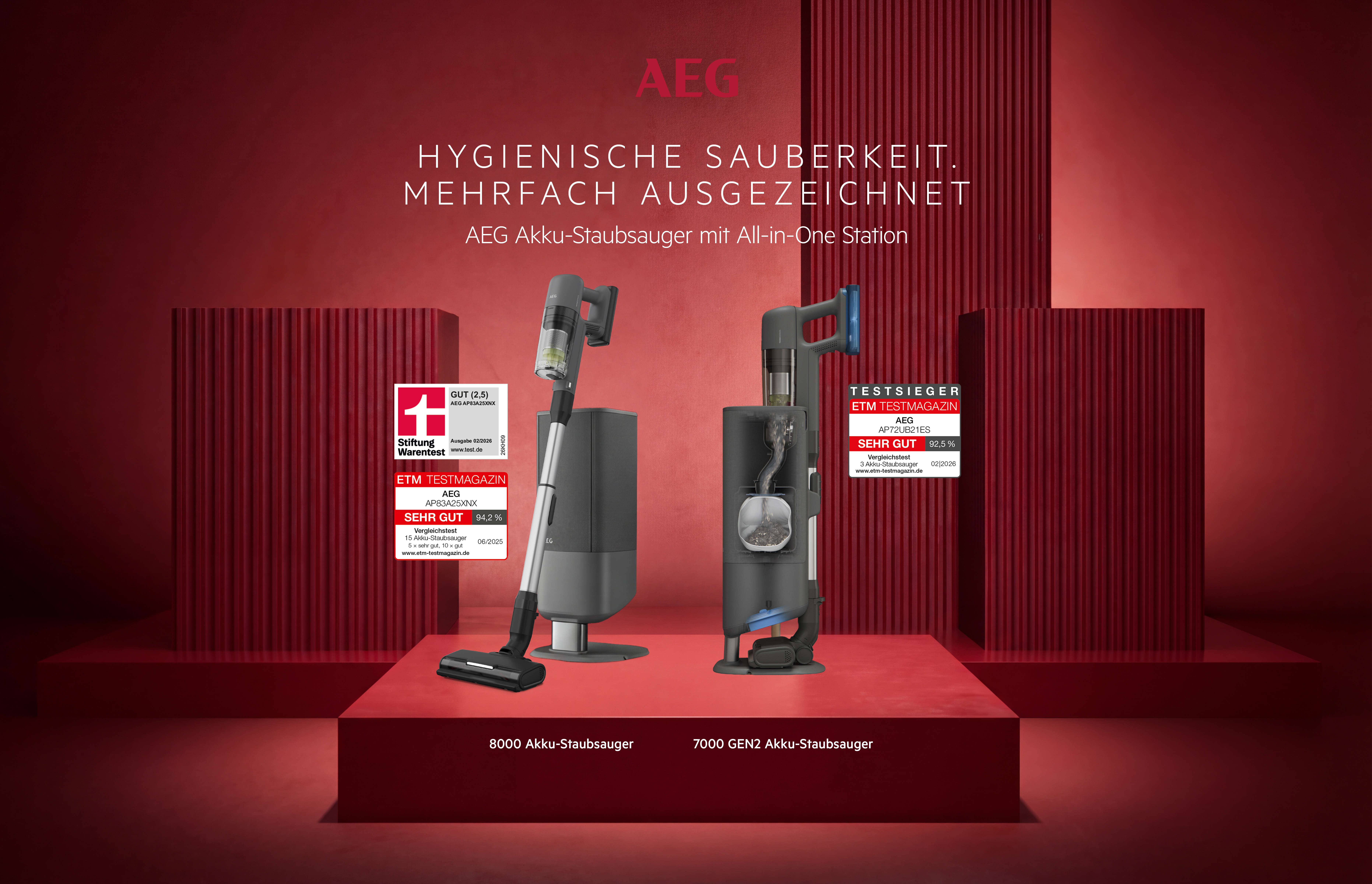 Die Premium-Marke AEG stärkt ihre Position im Premium-Segment der kabellosen Bodenpflege: Gleich zwei Akku Staubsauger mit All-in-One Station erzielen hervorragende Ergebnisse in unabhängigen Vergleichstests. Der AEG 7000 GEN2 Akku Staubsauger mit All-in-One Station (Modell AP72UB21ES) wird Testsieger im ETM TESTMAGAZIN, während der AEG 8000 Akku Staubsauger (Modell AP83A25XNX) im Testumfeld der Stiftung Warentest das Qualitätsurteil „gut“ erhält und sich unter den Top 3 platziert.